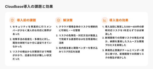本事例では、500件超のクラウドリスクを短期間で是正した取り組みをはじめ、導入の決め手やCloudbase導入後の変化、今後の展望について詳しくご紹介しています。