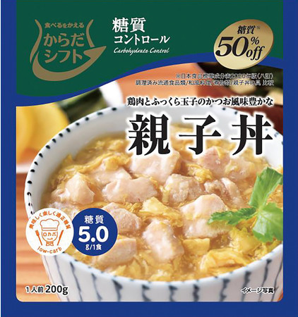 糖質50%off(※)、1食(200g)あたりの糖質量を5.0gに抑えた鶏肉とふっくら玉子の親子丼。卵のふわふわ感とだしにこだわり、かつおの風味豊かなつゆで仕上げました。環境配慮への一環として、外箱を無くしたスタンディングアルミパウチに変更。