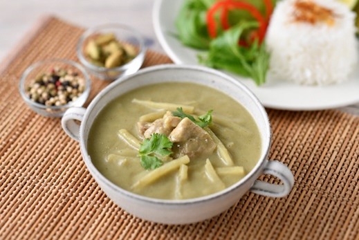・糖質40%off(※)、1食(140g)あたりの糖質量を4.9gに抑えた、青唐辛子の辛さ引き立つグリーンカレーです。レモングラスやこぶみかんの葉などの豊かな香りとココナッツミルクの甘みで、本格的な美味しさに仕上げました。環境配慮への一環として、外箱を無くしたスタンディングレンジパウチに変更。