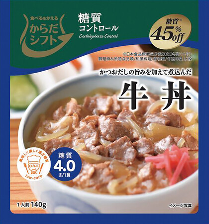 糖質45%off(※)、1食(140g)あたりの糖質量を4.0gに抑えたかつおだしの風味を加えて煮込んだ牛丼。柔らかな牛肉をかつおだしの風味をきかせたつゆで煮込みました。環境配慮への一環として、外箱を無くしたスタンディングアルミパウチに変更。