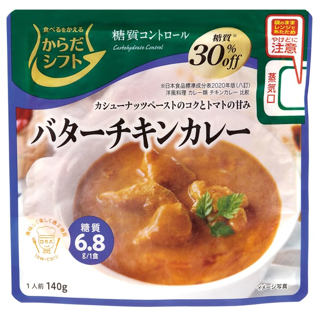 ・糖質30%off(※)、1食(140g)あたりの糖質量を6.8gに抑えた、完熟トマトの甘みと酸味に、バターとカシューナッツペーストでまろやかに仕上げたこだわりのバターチキンカレーです。環境配慮への一環として、外箱を無くしたスタンディングレンジパウチに変更。