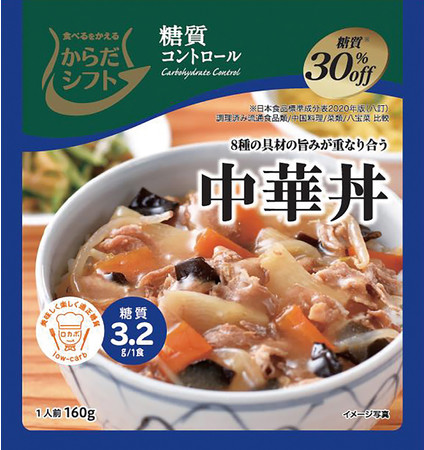 糖質30%off(※)、1食(160g)あたりの糖質量を3.2gに抑えた8種の具材とボリュームにこだわった中華丼。チキンとオイスターの旨味で本格的に仕上げました。環境配慮への一環として、外箱を無くしたスタンディングアルミパウチに変更。