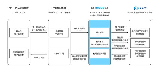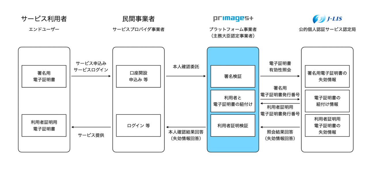 公的個人認証サービスとは、マイナンバーカードのICチップに搭載された電子証明書を利用して、利用者本人の認証や契約書等の文書が改ざんされていないことの確認を、公的に行う安全・確実なサービスです。プリマジェストは、システム、組織体制、セキュリティ、運用規程の整備等を総合的に評価され、公的個人認証サービスを適切に運用できるプラットフォーム事業者として主務大臣認定を取得しました。行政機関や民間事業者(以下、サービスプロバイダ事業者)は、署名検証業務をプリマジェストに委託することにより、公的個人認証サービスを導入することが可能となります。