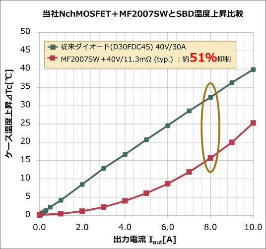 理想ダイオードとして使用する場合※1、従来ダイオード※2と比較し、温度上昇を約51%抑制させることが可能。
