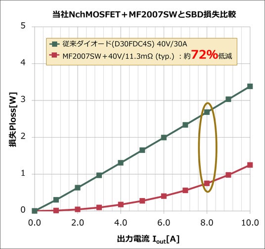 新電元工業は、このようなニーズに応えるべくHigh-side Nch-MOSFETゲートドライバIC「MF2007SW」を発売しました。本製品はNch-MOSFETと組み合わせることで、理想ダイオードとして使用可能となり、従来ダイオードと比べて電力の損失を約72%、温度上昇を約51%抑制することが出来ます。これにより車載製品など逆接続・逆電流保護を必要とする機器や、出力ORing用途の小型化、電力の低損失化に貢献します。