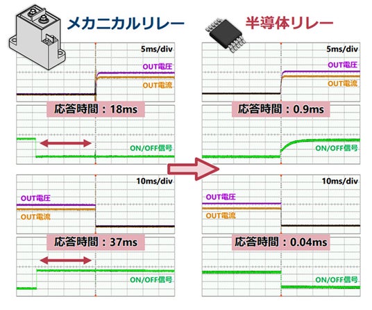 半導体リレーとして使用する場合、ON/OFF信号に対する動作時間が速く、メカニカルリレーと比べてON時は約1/20、OFF時は約1/1000の応答時間短縮を実現。