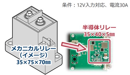 また、Nch-MOSFET2個と組み合わせることで双方向導通の半導体リレーとしても使用可能です。従来のメカニカルリレーと比べて応答時間を約1/1000に短縮、実装面積を約96%低減することが可能となり、高速応答・小型化に寄与します。