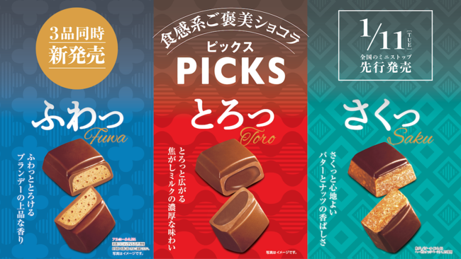 有楽製菓株式会社(本社:東京都小平市、代表取締役社長 河合辰信)は、新商品食感系ご褒美ショコラ「PICKS ふわっ」「PICKS とろっ」「PICKS さくっ」を、2022年1月11日(火)より全国のミニストップ店舗にて先行販売いたします。