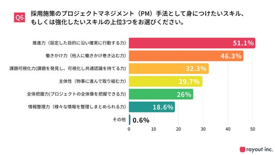 今回のアンケートを通して、採用現場では、限られたリソースで“プロジェクトを確実に遂行する”ことが重要であることが見えてきました。 また、採用施策をやりきるために身につけたいPMスキルとして「推進力」「働きかけ力」が上位にあがっています。