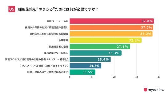 採用施策を“やりきる”ために必要なことは、「外部パートナー活用」(37.8%)、「採用以外業務の削減/役割分担の見直し」(37.5%)、「専門スキルを持った採用担当者の増員」(37.2%)と、プロジェクトに対する実行体制の整備が求められていることがわかりました。