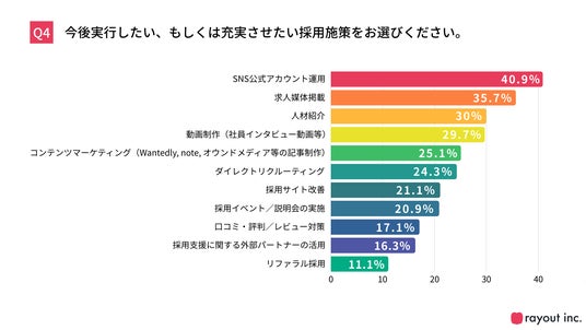 今後実行したい・充実させたい施策として最も多かったのは、「SNS公式アカウント運用」(40.9%)でした。次いで、「求人媒体掲載」(35.7%)、「人材紹介」(30.0%)、「動画制作」(29.7%)、「コンテンツマーケティング(Wantedly, note, オウンドメディア等の記事制作)」(25.1%)が続き、伝え方や見せ方の工夫を行うクリエイティブ業務に直結する領域が並びました。