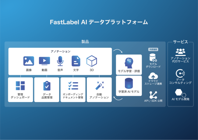 当社は2020年1月の創業以来、国内の大手企業を中心にAIデータプラットフォーム「FastLabel」を提供してまいりました。本プラットフォームは、教師データ作成の自動化機能や品質管理、プロジェクト管理、モデルの学習/評価機能を有したSaaS型システムと、データ収集や教師データ作成代行、モデル開発等のサービスを包括した統合型のプラットフォームです。本プラットフォーム活用により、データ作成コストの7割削減、AI精度の3割向上を実現しています。