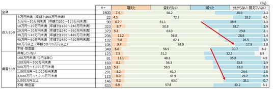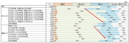 「ボランティア活動・地域活動」「家族や友人など、親しい人達との団らん」の状況について、収入・金融資産ランク別(図表4、5)でみると、収入や資産額が少ない層ほど「減った」と回答する割合が高い。経済状況が、つながりの維持に影響を与えている可能性があることが示唆される。