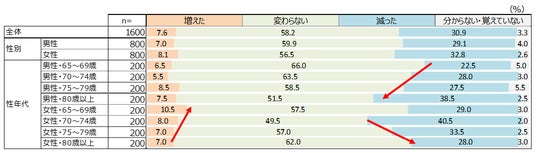 性年代別で傾向の違いがみられたのが、「家族や友人など、親しい人達との団らん」「世代を問わず様々な人との交流」である(図表2、3)。男性は年代が上がるほど「減った」と回答する割合が高くなる一方、女性は年代が上がるほどその割合が低くなる傾向がある。高齢男性においては他者とのつながり維持が社会的課題とされているが、本調査ではその深刻な実態が明らかになった。
