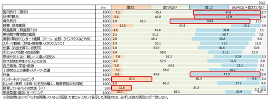 一方で、「インターネットショッピング」「飼育しているペットの世話」については、「増えた」という回答が「減った」を上回った。これらも、コロナ禍での外出制限によって変化・定着した行動と考えられる。