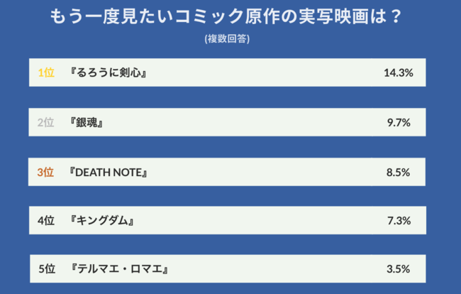 他にも『銀魂』『DEATH NOTE』『キングダム』『テルマエ・ロマエ』など、いずれも映画シリーズとして2作品以上製作・公開されている作品がランクインする結果となりました。