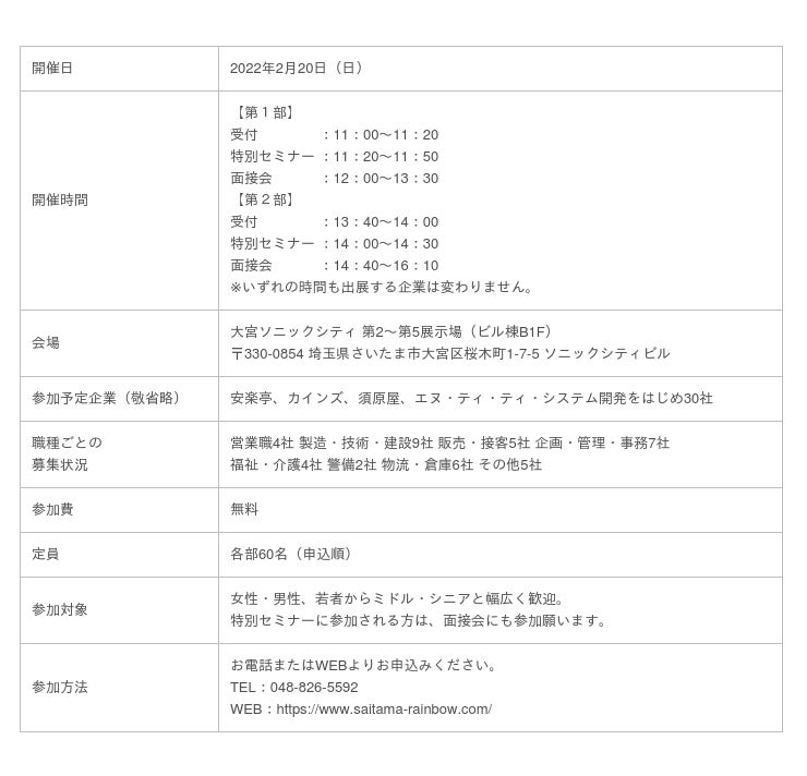 こうした企業と、女性・男性、若者からミドル・シニアまで多彩な人たちを結ぶ“虹の架け橋”となる「レインボー面接会」を年4回開催しており、大宮ソニックシティで2月20日(日)に開催します。