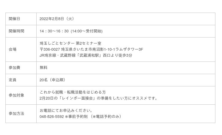 電話:048-826-5592(平日10時~19時) e-mail:saitama-rainbow@os.tempstaff.jp
