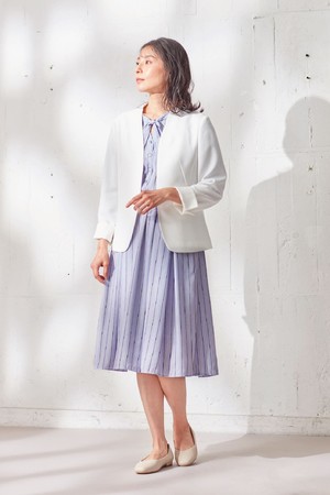 ストライプ柄が特徴のデザインワンピースと、麻調ジャケットのコーディネート。細見えする縦ライン柄のワンピースはウエストゴム仕様でブラウジングしても着用可能です。また胸元のボウタイリボンもデザインのアクセントに。ジャケットは色々なインナーとコーディネートしやすいシンプルなノーカラー仕様。名刺やスマホ等を入れられる内ポケットが付いているのもうれしいポイントです。