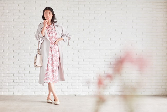 さっと羽織るだけで着こなしが決まる、スタイリッシュなトレンチコートに、春らしい花柄が華やかなワンピースを合わせたコーディネート。トレンチコートはドライタッチで肌離れが良く軽やか、こなれ感のある風合いがあり、高級感のある素材です。袖口のベルトやフラップポケットなどディティールにこだわりつつ着やすく仕上げています。ワンピースのウエストはゴムでブラウジングするデザインとなっていて、リラックス感のある着心地ながらメリハリがでてスタイルよく着こなせます。