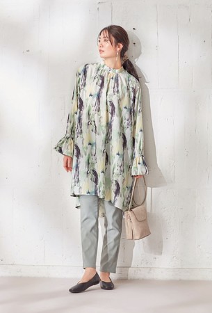 鮮やかなブルーが春に映えるコーディネート。チュニックブラウスは比翼見えの襟元デザインと落ち感ある素材がカジュアルながら上品な印象。レギンス感覚ではける柄パンツを合わせることで無難になりがちなレイヤードスタイルのおしゃれ度もアップします。