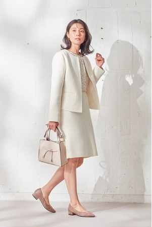 ジャケットとスカートはツイード素材を使用したセットアップ。春のオケージョンシーンにもぴったりのアイテムです。ジャケットはデニムパンツ等と合わせれば、カジュアルな着回しも出来る万能アイテム。ブラウスは幾何柄風の小花柄が甘すぎず取り入れやすいデザインで、襟元と袖口にギャザーを寄せてフェミニンな雰囲気。前ボタンあきで着用しやすいのもうれしいポイント。サイドスリット入りでパンツとも相性も良いアイテムです。