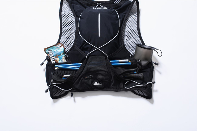 HydraPak(R) 500ml SOFTFLASK 2本付属/本体に通気性に優れたオープンエアメッシュを使用/カスタマイズ調整可能なバンジ一ストラップ/正面左胸にストレッチジッパー ポケット/正面にストレッチメッシュを採用したマルチポケット/調整可能なサイドコンプレッションシステム/背面にジッパー付きリザーバーコンパートメント/背面全体に大きなストレッチメッシュポケット/背面底部にキークリップ付きセキュリティーポケット/背面底部にポールホルダー /レスキューホイッスル付き/リフレクターロゴプリント