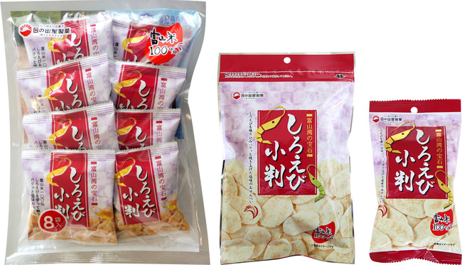 今回は「しろえび小判」のメイン商品である8袋の個包装となっているおやつ商品「8Pしろえび小判」に加えて、新商品の「しろえび小判70g」、「しろえび小判30g」を展示します。