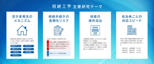 当社が運営する相続に関するプラットフォーム事業「みんなの相続窓口」で蓄積されたデータを活用し、相続を工学的なアプローチで紐解き、空き家や財産の首都圏一極集中など、相続をきっかけとして生じる社会課題の解決を目指す独自の研究です。2021年4月に筑波大学の社会工学に関する部門との共同研究を開始し「相続工学」と銘打った相続に関するメカニズムの解析に取り組み始めました。従来、法学や行政論の中で研究されてきた相続について、工学の切り口で研究することによりユニークなテーマの論文が生まれました。2024年には麗澤大学(千葉)に相続工学研究センターを開設し、さらに研究を進めています。