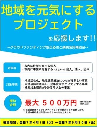 市の活性化や地域課題解決につながる新しい事業(取組)について、クラウドファンディング型ふるさと納税で募った寄附金をもとに、事業(取組)にかかる経費の一部を補助します。