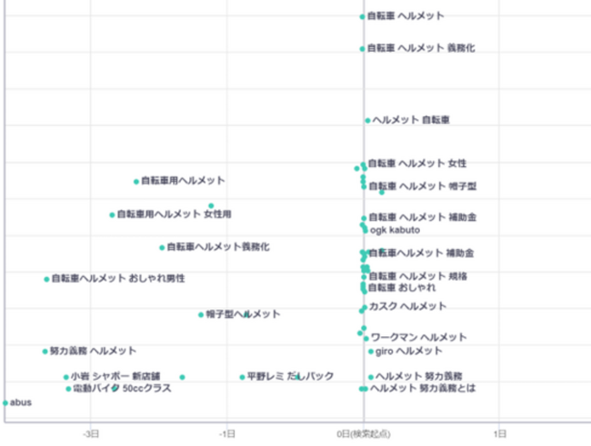 「自転車 ヘルメット おしゃれ」が最も多く検索された日を「0日」として検索起点とすると、2日前に「自転車ヘルメット義務化」を検索していることが分かります。多くのユーザーは、義務化について調べた後、帽子型などの日常使いができるおしゃれなヘルメットを探しているようです。