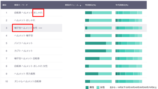 「ヘルメット」と一緒に検索されたキーワードを見ると、中でもおしゃれなヘルメットを求めて検索している女性が多いと推察され、それまでヘルメットを着用していなかった人が新たにヘルメットを着用する際におしゃれ度を重視する可能性があることが分かりました。また、「帽子型ヘルメット」を男女ともに検索していることから、日常で違和感なく使えるヘルメットのニーズが高いことが読み取れました。年代別割合では、40,50代の女性がヘルメットを検索していますが、「ヘルメット 努力義務化」を検索している割合は、他のキーワードに比べて10代、20代が高いことが分かりました。