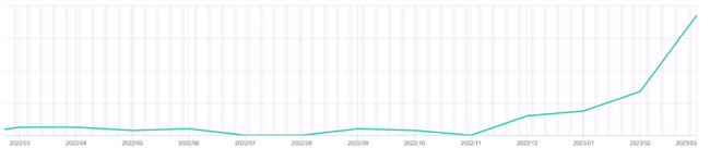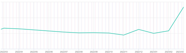 はじめに、2022年3月から2023年3月の「ヘルメット」の検索推移を調べたところ、2023年2月から「ヘルメット」の検索ボリュームが急増していることが分かりました。4月1日の改正道路交通法施行を前に、ヘルメット着用への関心が高くなったことの影響だと考えられます。