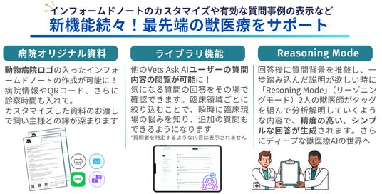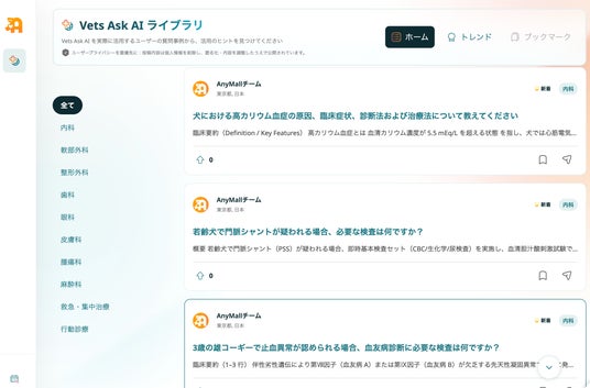 11万件を超える質問回数は、初期のトライアル利用を超え、日々の診療業務における「実用的なパートナー」として本サービスが現場に定着していることを示しています。この膨大な対話データの中に含まれる「現場のリアルな悩み」や「高度なAI活用事例」を業界全体の資産として還元するため、新機能「Vets Ask AIライブラリ」をリリースいたしました。
