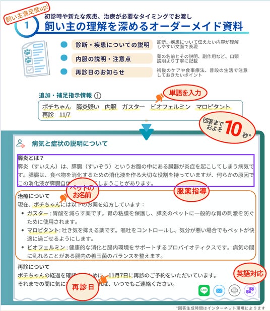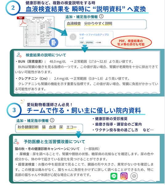 動物病院での説明内容をもとに、飼い主様がご自宅でも家族に説明でき、ホームケアを適切に実践できる説明資料を生成します。説明資料のレベルは、飼い主様の理解度に合わせて3段階で調整可能。