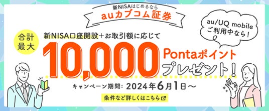 KDDI株式会社(本社:東京都千代田区、代表取締役社長:高橋 誠、以下「KDDI」)とauカブコム証券株式会社(本社:東京都千代田区、代表取締役会長兼社長:二宮 明雄、以下 「auカブコム証券」)は、2024年6月1日から、期間中にauカブコム証券のNISA(少額投資非課税制度)口座を新規開設したお客さまを対象に、投信買付額に応じてポイントをプレゼントする「NISAで資産形成デビュー応援キャンペーン」(以下 本キャンペーン)を実施します。au/UQ mobileをご利用中のお客さまには最大10,000ポイント、それ以外のお客さまにも最大5,000ポイントをプレゼントします。