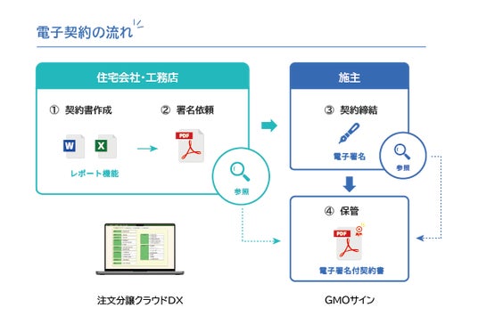 今回、両サービスの連携により、請負契約書の作成から締結、保管までのプロセスがすべて電子化されます。ご好評いただいている「注文分譲クラウドDX」の電子承認機能や電子受発注機能と組み合わせることで、住宅会社の更なるペーパレス化が進みます。