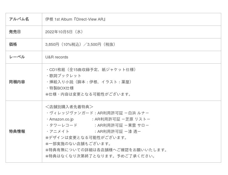 ボカロ文化の祭典「The VOCALOID Collection ~2021 Spring~」のルーキーランキングで第5位を獲得し、人気歌い手Adoの1stアルバム『狂言』収録の『過学習』を手掛けるなど、瞬く間に注目を集めたボカロPの伊根。自身初のCDとなる本アルバムは、ニコニコ動画で殿堂入りを果たした『ルーセ』や人気曲『イデアル』をはじめ、完全書き下ろしの新曲や提供曲のセルフカバーなどを含めたボカロオリジナル楽曲全15曲を収録。さらに、伊根が脚本を務め、イラストレーター薬屋が挿絵を手掛けた小説も同梱し、伊根の世界観を存分に堪能できる1枚になっています。発売日は2022年10月5日(水)で、店舗別購入特典として、「AR利用許可証」カードを先着でプレゼントします。