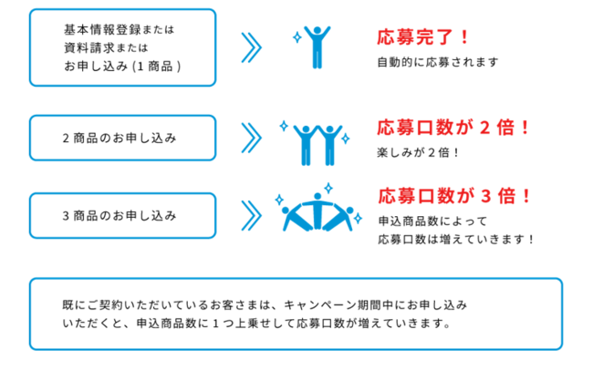 ※既にSBI生命の保険商品をご契約中の方は、日頃のご愛顧に感謝を込めて、申込商品数に1つ上乗せして応募口数が増えていきます(1つの保険商品のお申込みで応募口数が2口、2つの保険商品のお申込みで応募口数が3口)。