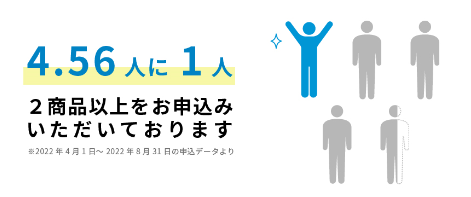 SBI生命のインターネット申込みでは、4.56人に1人の方に2商品以上をお申込みいただいております。2つ以上の保険商品をセットで加入し、より手厚くリスクに備えてみてはいかがでしょうか。ぜひこの機会にご検討ください。