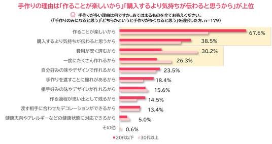 手作りを選ぶ理由を聞いたところ、全体でみると「作ることが楽しいから(67.6%)」「購入するより気持ちが伝わると思うから(38.5%)」が上位を占め、特に10~20代で多いことがわかりました。一方、30代以上は「費用が安く済むから(45.3%)」「一度にたくさん作れるから(30.1%)」が比較的多く、主婦層は金銭面も手作りを選ぶ理由として高い傾向にありました。