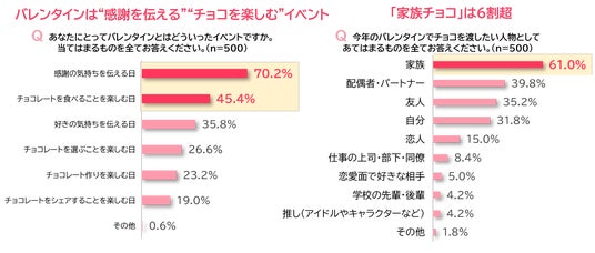 「あなたにとってバレンタインとはどういったイベントですか」と聞いたところ、「感謝の気持ちを伝える日(70.2%)」「チョコレートを食べることを楽しむ日(45.4%)」が、「好きの気持ちを伝える日(35.8%)」よりも多い結果に。