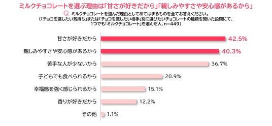 それほどミルクチョコレートを選ぶ理由を聞いたところ、「甘さが好きだから(42.5%)」「親しみやすさや安心感があるから(40.3%)」「苦手な人が少ないから(36.7%)」が上位になり、子どもの頃から慣れ親しんだ甘さや味だからこそ、好きな人が多く、どんな相手にも渡せることがわかりました。
