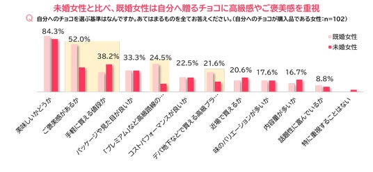 また、婚姻状況で比較すると、未婚女性は40.7%に上り、既婚女性(22.3%)の約2倍もの割合で、自分にチョコレートを渡すことも明らかになりました。