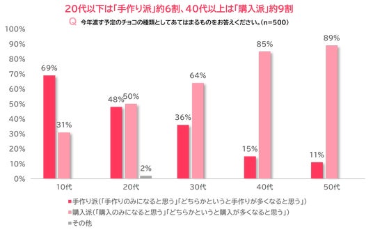 年代別にみると、20代以下は「手作り派」が多く約6割にのぼり、反対に40代以上では「購入派」が約9割にのぼり、若年層になればなるほど「手作り派」が多くなる傾向があることがわかりました。なお背景には、10代の86%が友人に今年チョコレートを渡す予定と回答しており、いまだ根強い友チョコ文化がアフターコロナで完全復活したことも一因として考えられます。