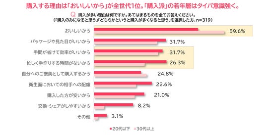 購入を選ぶ理由については、「おいしいから」が特に30代以上で多く、全世代で1位に。また、「手作りする時間がないから(35.0%)」「購入の方が効率がいい(33.1%)」と、タイムパフォーマンスを考えて購入を選んでいる人は20代以下の方が割合が大きい傾向にあることもわかりました。