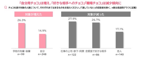 実際に今年のバレンタインでチョコを渡したい人物を聞いたところ、「家族(61.0%)」「配偶者・パートナー(39.8%)」「友人(35.2%)」等身近な人が上位に並び、「恋愛面で好きな相手」はわずか5%と1割未満にとどまりました。ここ2~3年でのチョコを渡す人数の変化について、渡す相手別にみても、渡す人数が比較的“増えた”のは「学校の先輩・後輩(26.3%)」「自分(14.9%)」で、“減った”のは「仕事の上司・部下・同僚(27.9%)」「恋愛面で好きな相手(26.7%)」「恋人(17.1%)」という結果に。
