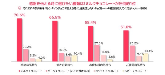 伝えたい気持ちや渡す相手別に、渡したいチョコレートの種類について聞いたところ、感謝の気持ちを伝える際に最も渡したいのは「ミルクチョコレート」が70.6%と、他を圧倒する結果に。さらに「好きの気持ち(66.8%)」「お疲れ様の気持ち(58.4%)」「ご褒美の気持ち(51.0%)」の時も、また、友人・自分・推しなどの相手別でもすべてでミルクチョコレートが選ばれました。