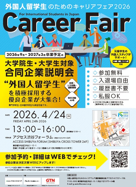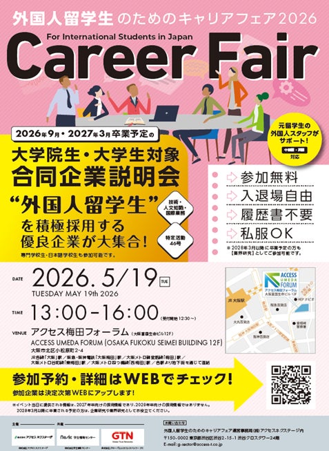 株式会社学生情報センター(本社:京都府京都市、代表取締役社長:吉野一樹、以下、「ナジック」)、株式会社アクセスネクステージ(本社:東京都渋谷区、代表取締役社⾧:増田智夫)、株式会社グローバルトラストネットワークス(本社:東京都豊島区、代表取締役社長:後藤裕幸)の3社は、2026年4月24日(金)に東京、5月19日(火)に大阪にて、日本での就職を希望する外国人留学生を対象とした合同企業説明会「外国人留学生のためのキャリアフェア2026」を共催いたします 。なお、本フェアは2023年度より毎年春・秋に開催しております。