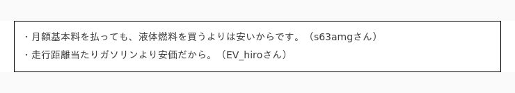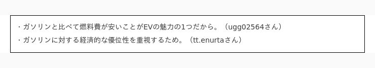 先ほど、「充電料金が気になる」と回答した方のコメントでもあったガソリン代と充電料金の比較。「充電料金は気にならない」と回答した方は、ガソリンより充電料金の方がまだ安価ととらえているようです。